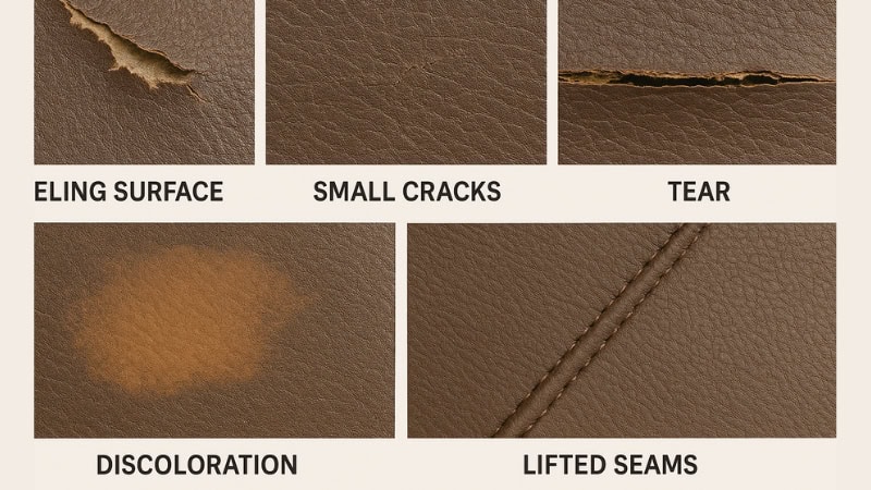Fake leather doesn’t age the same way real leather does, so the type of damage you see often reveals the repair method you’ll need. Before grabbing a filler or patch, it helps to recognize what’s actually happening on the surface. This section breaks down common issues and how to judge whether a fix is practical.